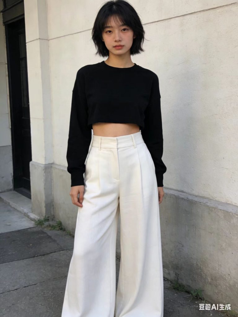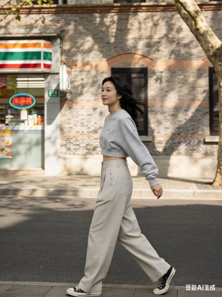 浅灰色短款卫衣搭配高腰微阔腿休闲裤,脚踩帆布鞋,随性又自在,是课后出门放松的绝佳穿搭。